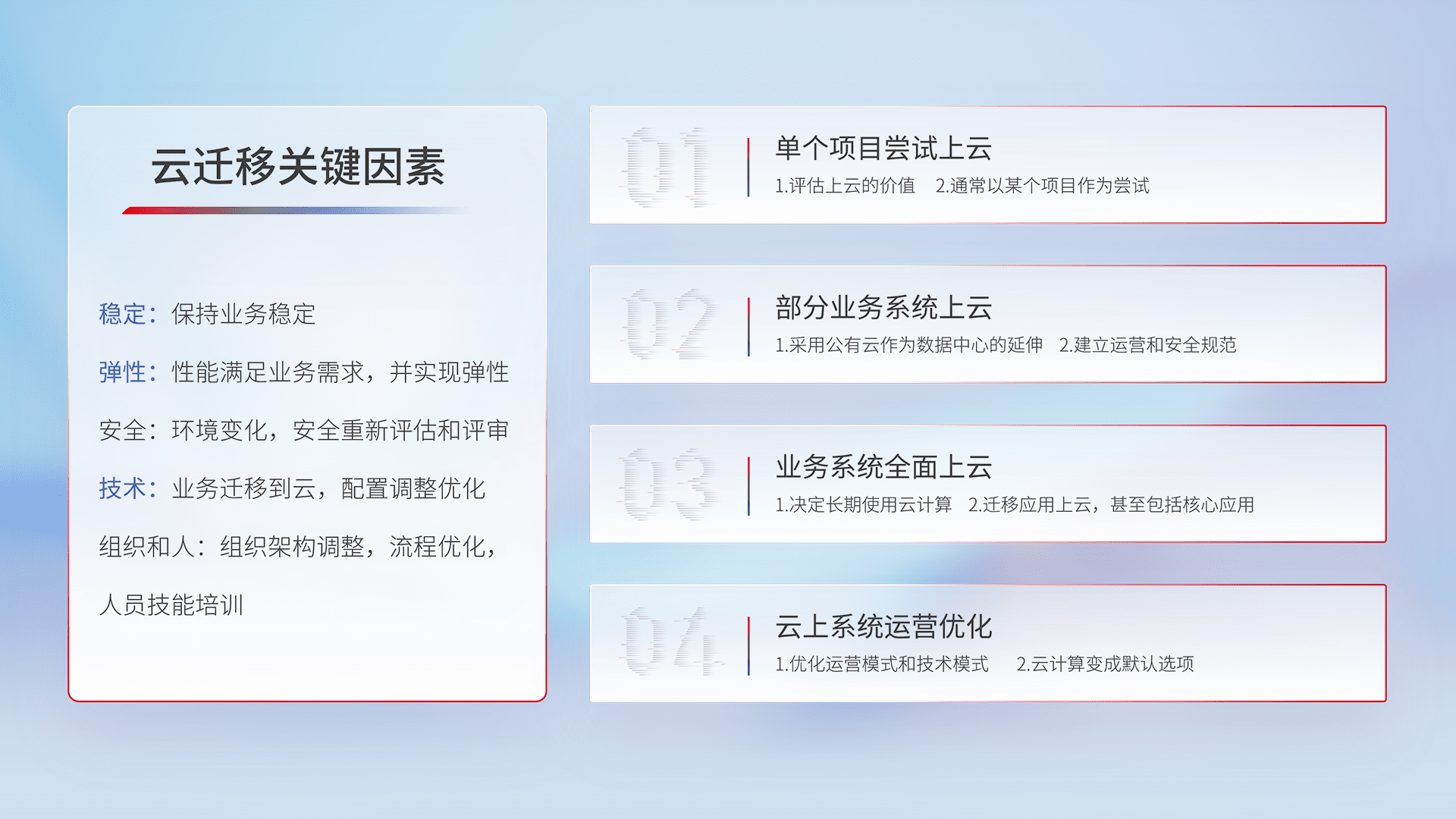 结合实际业务,,,,从规划设计、、云平台选型、、云原生改造、、、数据迁移、、集成交付,,,,迁移全过程为客户识别最佳上云路径,,做好风险识别管理,,设计网络架构、、身份权限、、安全审计合规、、、、操作审计、、、、日志审计、、、监控告警策略、、多站点容灾设计等,,,对云上基础设施进行整体规划,,提升IT治理水平,,以满足弹性、、高可用、、高性能的需求。。。。