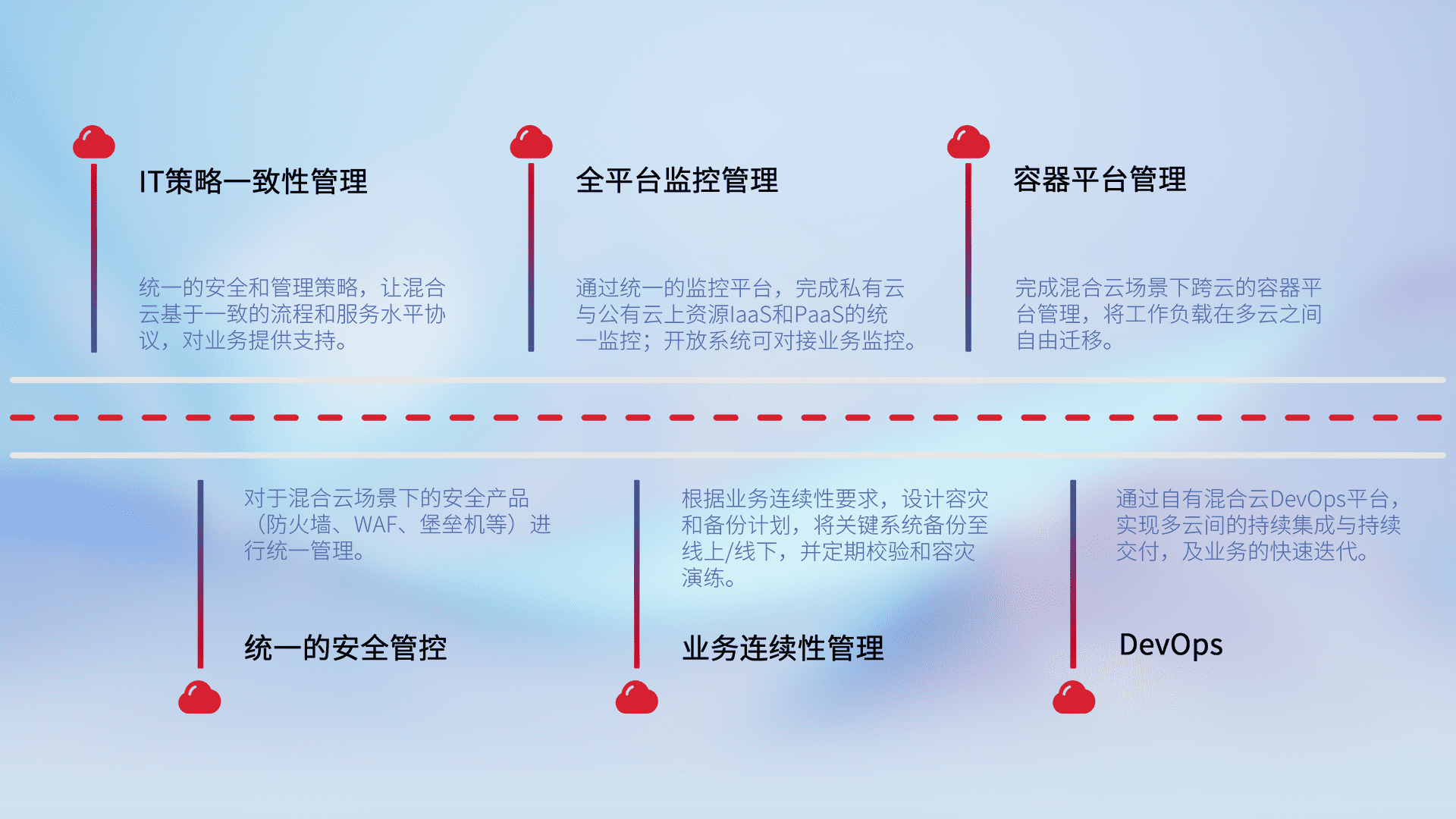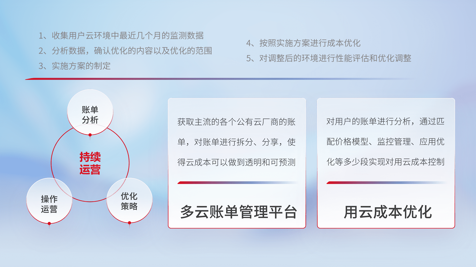 通过多云纳管,,以统一的资源数据模型把客户的云资源进行抽象和封装,,进而实现对多云资源的统一操作,,保障云资源管理的可靠性、、、稳定性与可用性。。。量身定制化运维内容,,,,配置、、开发运维、、补丁管理、、、备份、、、、监控、、、、认证和访问管理、、、、审计和日常巡检等,,,,保障在用云过程中的可靠度,,,稳定度以及高可用率。。